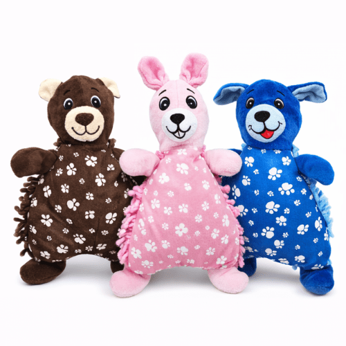 El peluche para perros con diseño de animales y estampado de huellitas es una opción ideal para brindar entretenimiento y confort a tu mascota. Este set incluye figuras adorables como oso, conejo y perro, con un diseño acolchado que invita a morder, abrazar y jugar.
